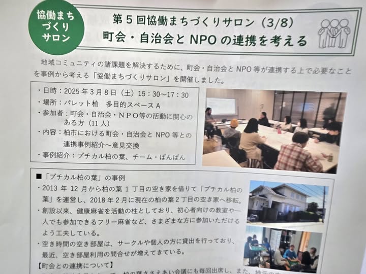 さて、3月8日にパレット柏で開催された「第5回協働まちづくりサロン」(主催:市民活動サポートコーナー)に代表の二瓶が参加し、“町会・自治会とNPOの連携を考える”テーマについて、プチカル柏の葉の事例をご紹介しました。その際の記事が「柏市民活動ニュースレター第36号」に掲載されていますので、ぜひご覧ください。